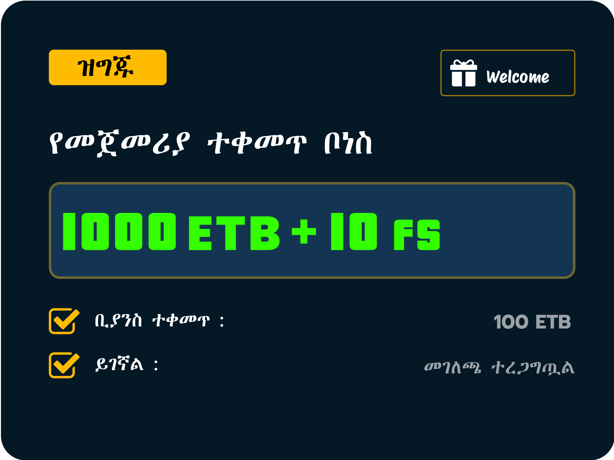 💸 አሁን ክፍያ ያድርጉ እና 1000 ብር ቦኑስ እና 10 ነፃ ስፒን 🎰💰 ያግኙ! ቀሪ ገንዘብዎን ያስጨምሩ፣ ለትልቅ ሽልማቶች ይስፒኑ፣ እና በእያንዳንዱ እርምጃ ተጨማሪ ሽልማቶችን ይቀበሉ 🚀✨ ደስታና ሽልማቶችን አትጣሉ! 🌟